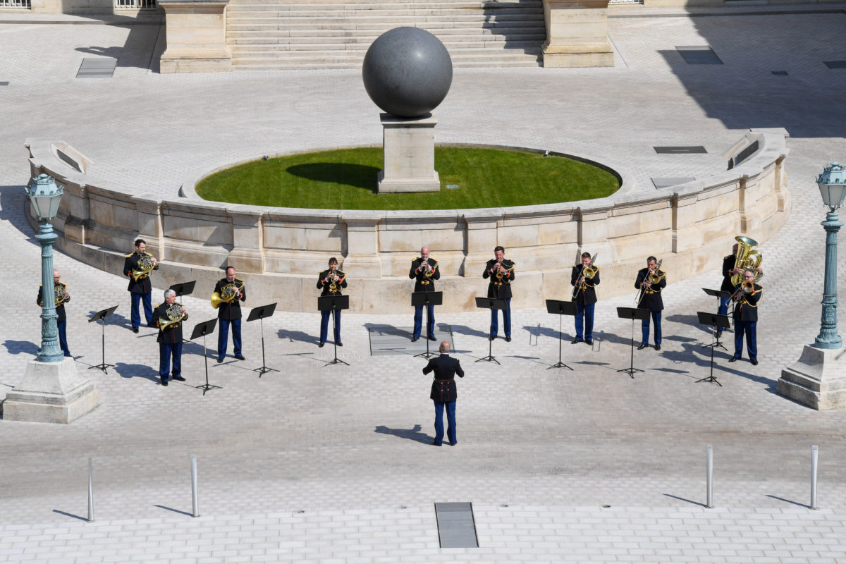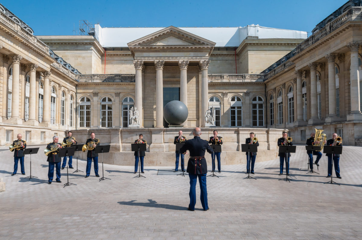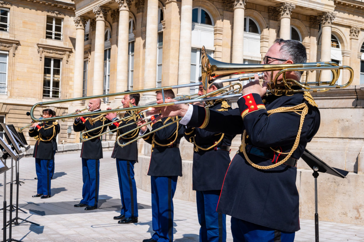 Et quel plus bel endroit que la cour d’honneur de l’Assemblée nationale pour faire résonner cors, trompettes, trombones et tuba !
